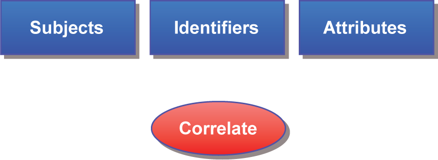Correlate means to associate attributes with particular entities, to associate what we know about someone with either an identifier in the system or a subject in question.